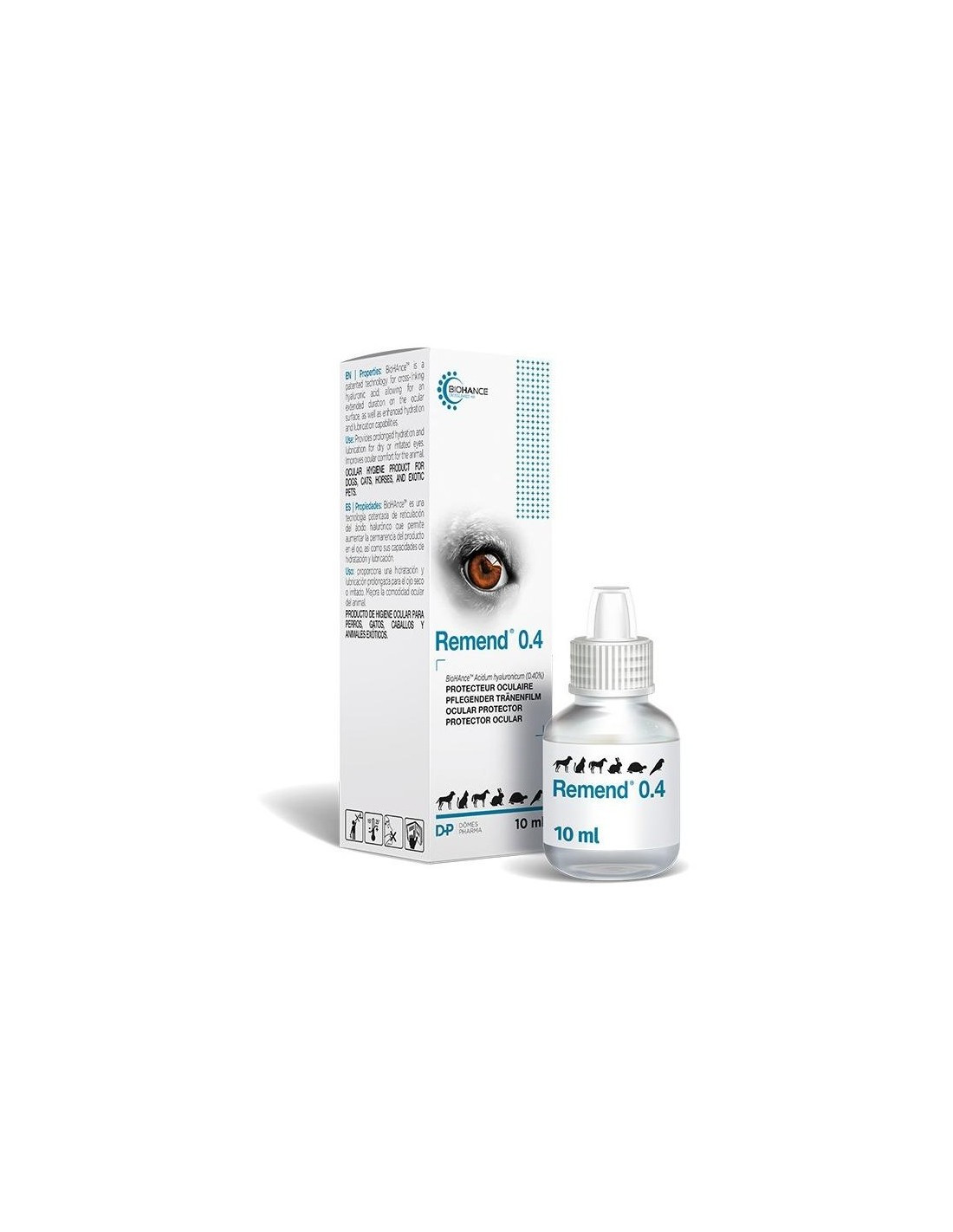 Solución oftálmica veterinaria formulada con ácido hialurónico en concentración del 0,40 % (tecnología BioHAnce) que proporciona una película protectora, prolonga el tiempo de permanencia en la superficie del ojo y mejora la lubricación e hidratación ocular en animales con ojo seco, irritado o expuesto a condiciones que afectan la película lagrimal.