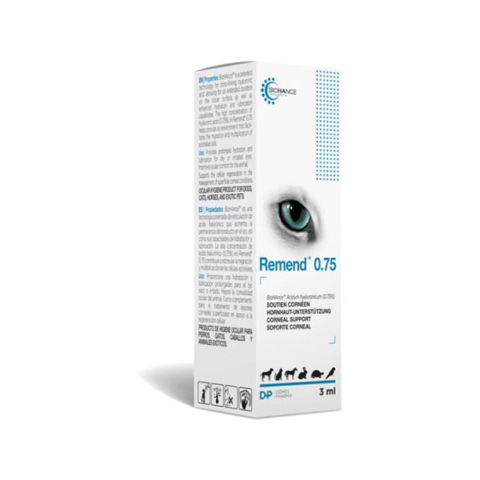 Remend 0.75 es una solución ocular formulada con ácido hialurónico reticulado (tecnología BioHAnce) al 0,75?% indicada como complemento en el tratamiento de lesiones corneales superficiales y para la hidratación prolongada del ojo en perros, gatos, caballos y especies exóticas.